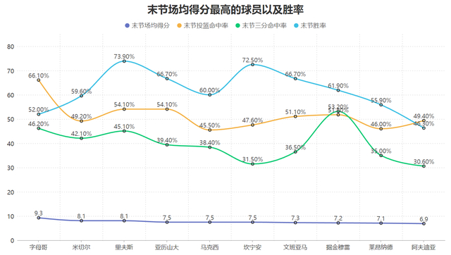 本赛季里夫斯的个人数据暴涨只是一方面,他更加值得信赖的是末节能力以及面对高强度防守时的硬解能力,本赛季的他末节场均贡献8.1分为四节中的最高,并且末节两项命中率飙升到54.1%与45.1%,而这样的表现放眼联盟也是顶尖水准:
