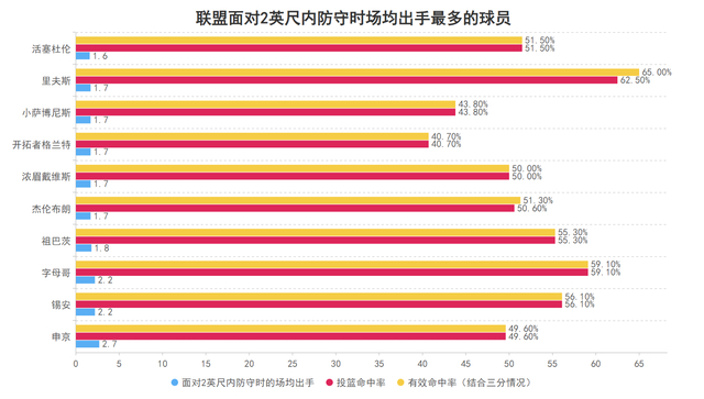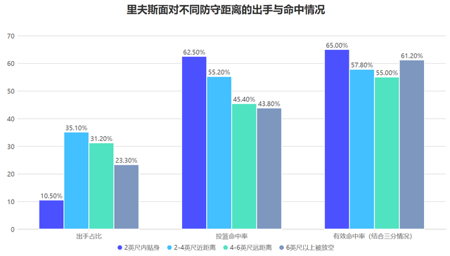 在联盟面对2英尺内的贴身防守时场均出手最多的是火箭申京的2.7次,里夫斯虽然场均出手数达不到如此高但场均1.7次也高居第九,并且里夫斯在面对2英尺内防守时投出了62.5%的投篮命中率以及65%的有效命中率,这双项命中率位于面对2英尺内防守时场均出手最多的20名球员中的第一。